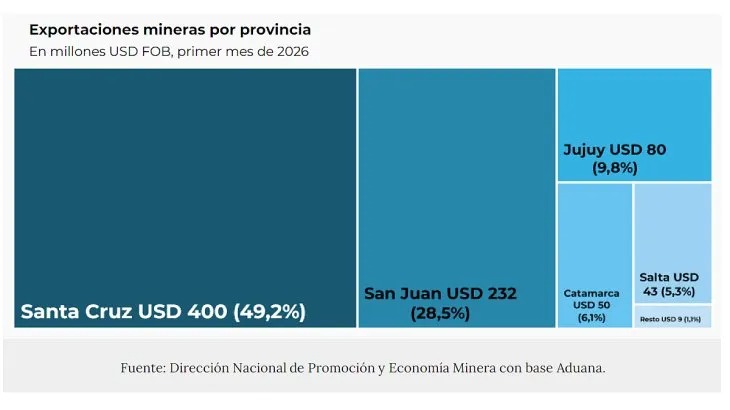 Las exportaciones mineras alcanzaron en enero de 2026 los u$s812 millones, el mayor registro para ese mes en la serie histórica, superando ampliamente los u$s446 millones de enero de 2025.